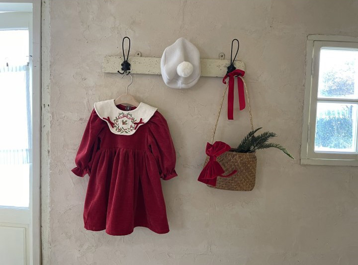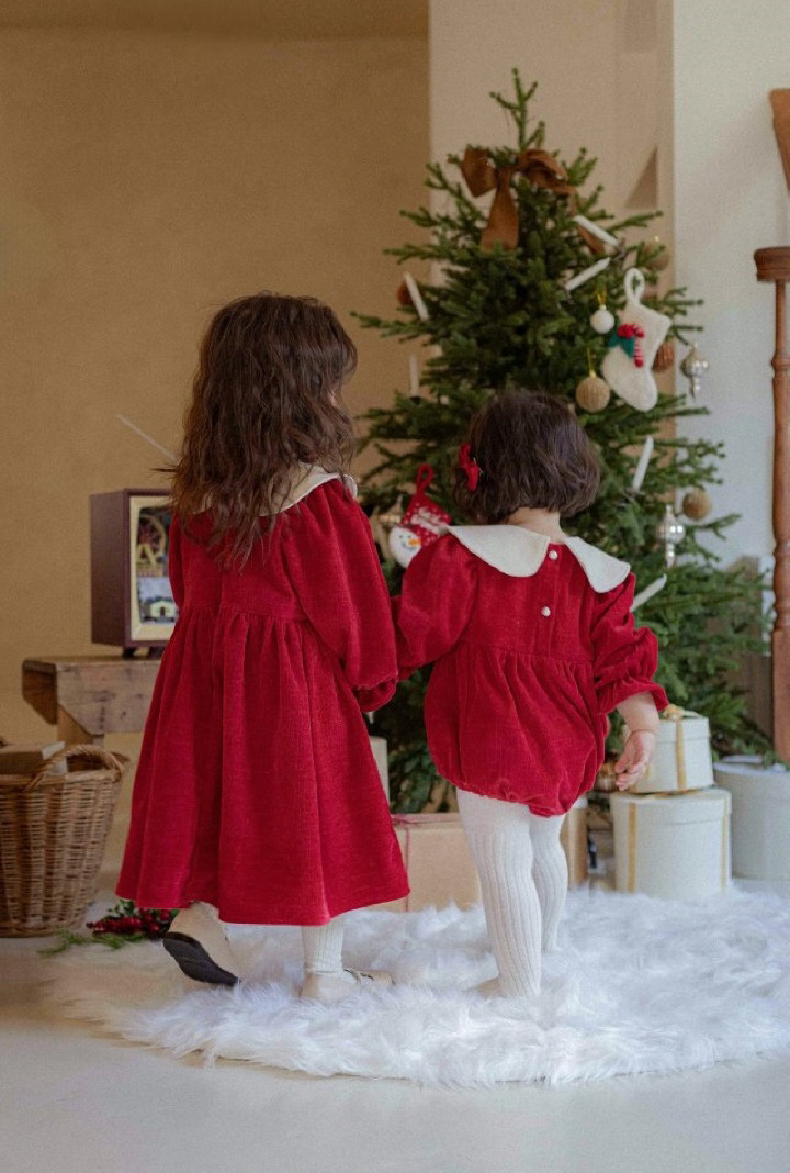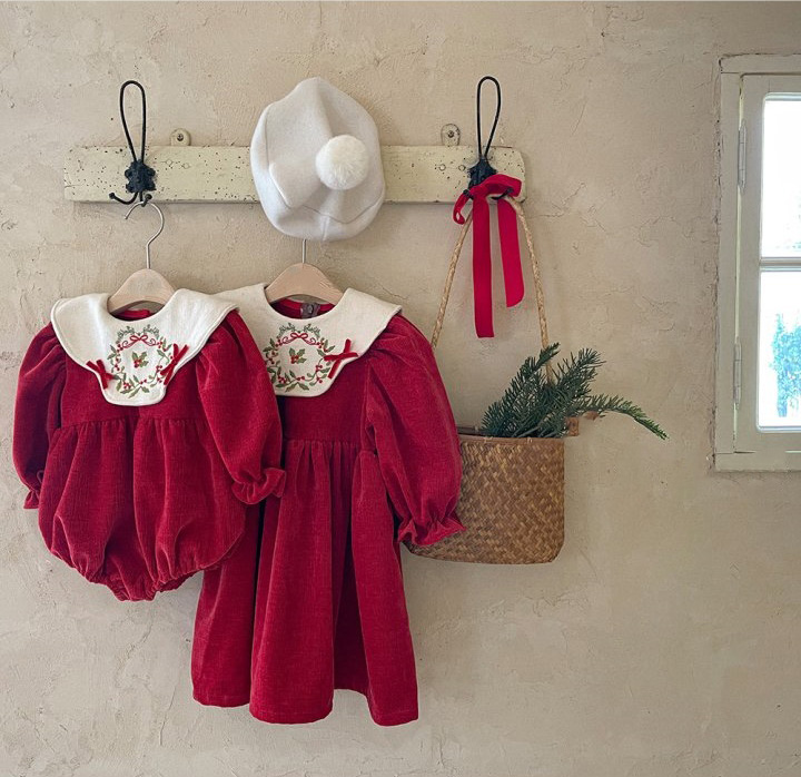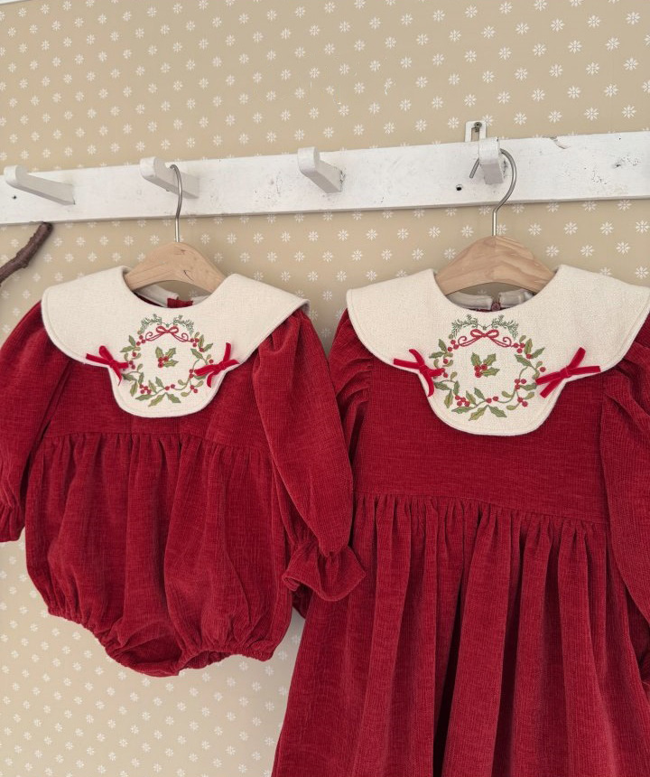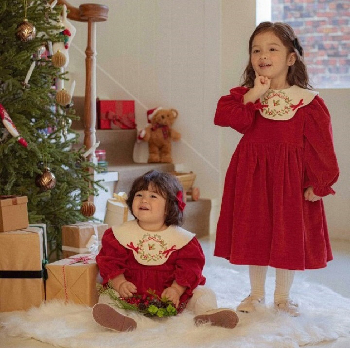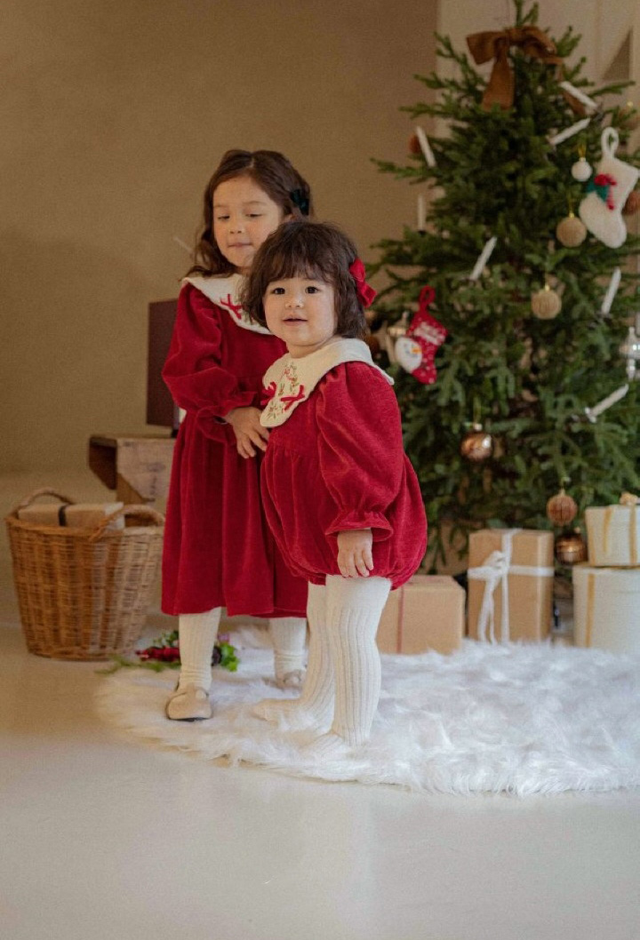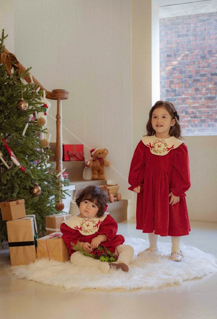 This beautiful Christmas dress is made from soft velvet fabric, offering a rich texture and a cozy feel for little ones. Designed in a classic silhouette, it features long sleeves with gentle gathers and a charming embroidered collar that adds a timeless, vintage-inspired touch.