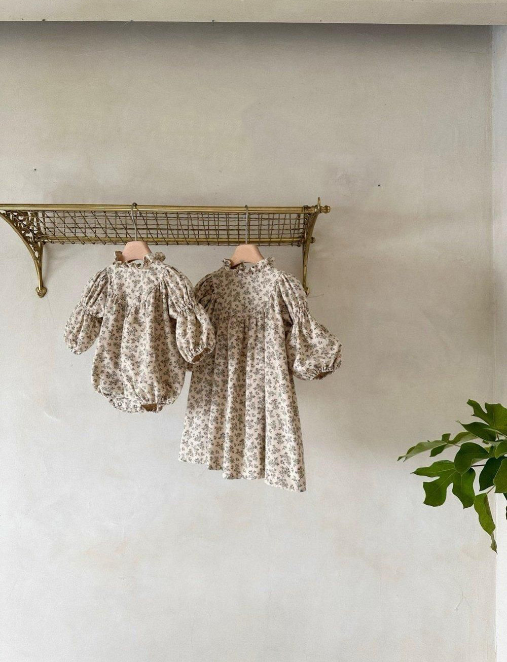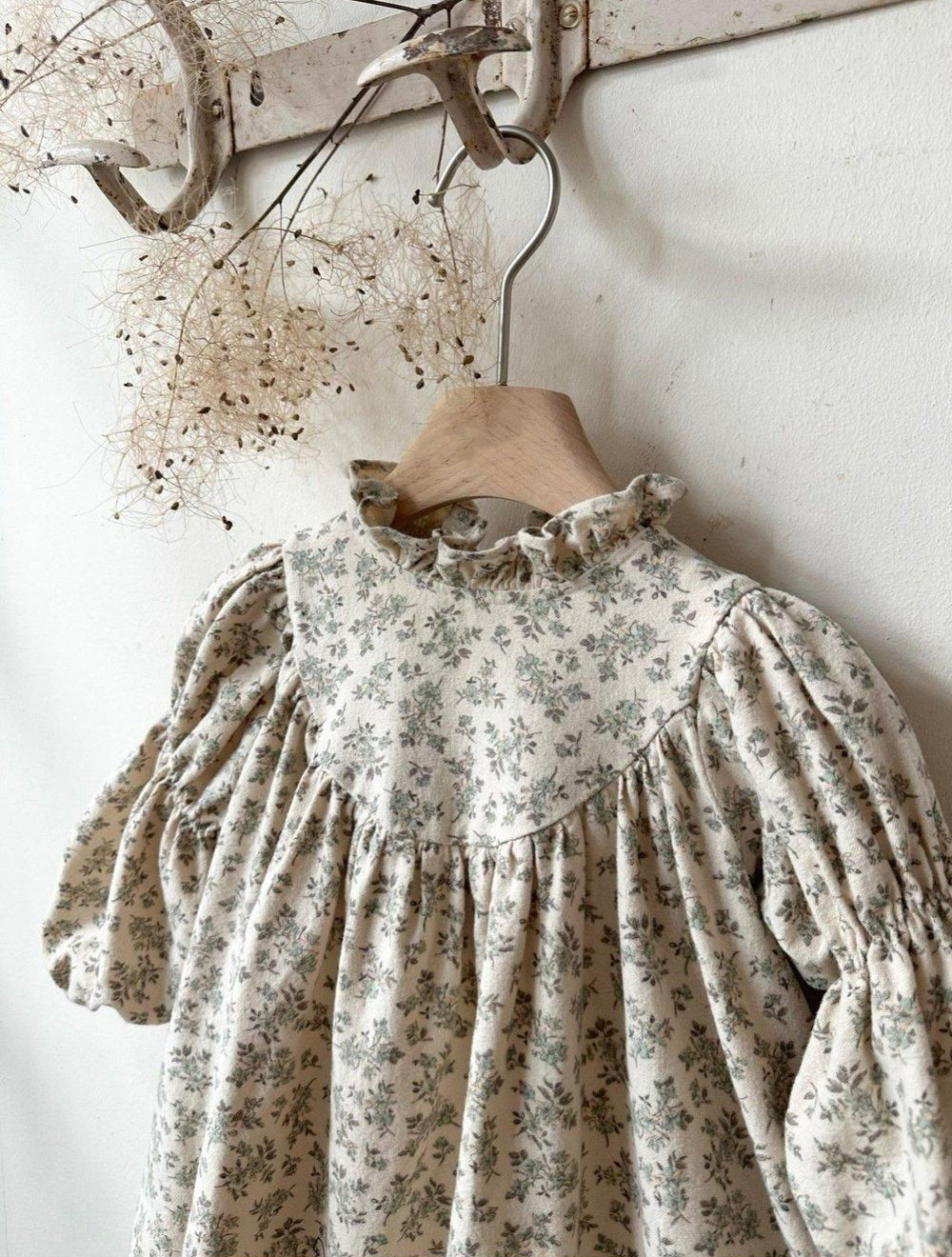 The sweetest fall romper, made of organic cotton. A beautiful, cozy, comfortable fabric, which offers comfort and warmth. Features an empire collar, puffy sleeves gathered at the wrists.