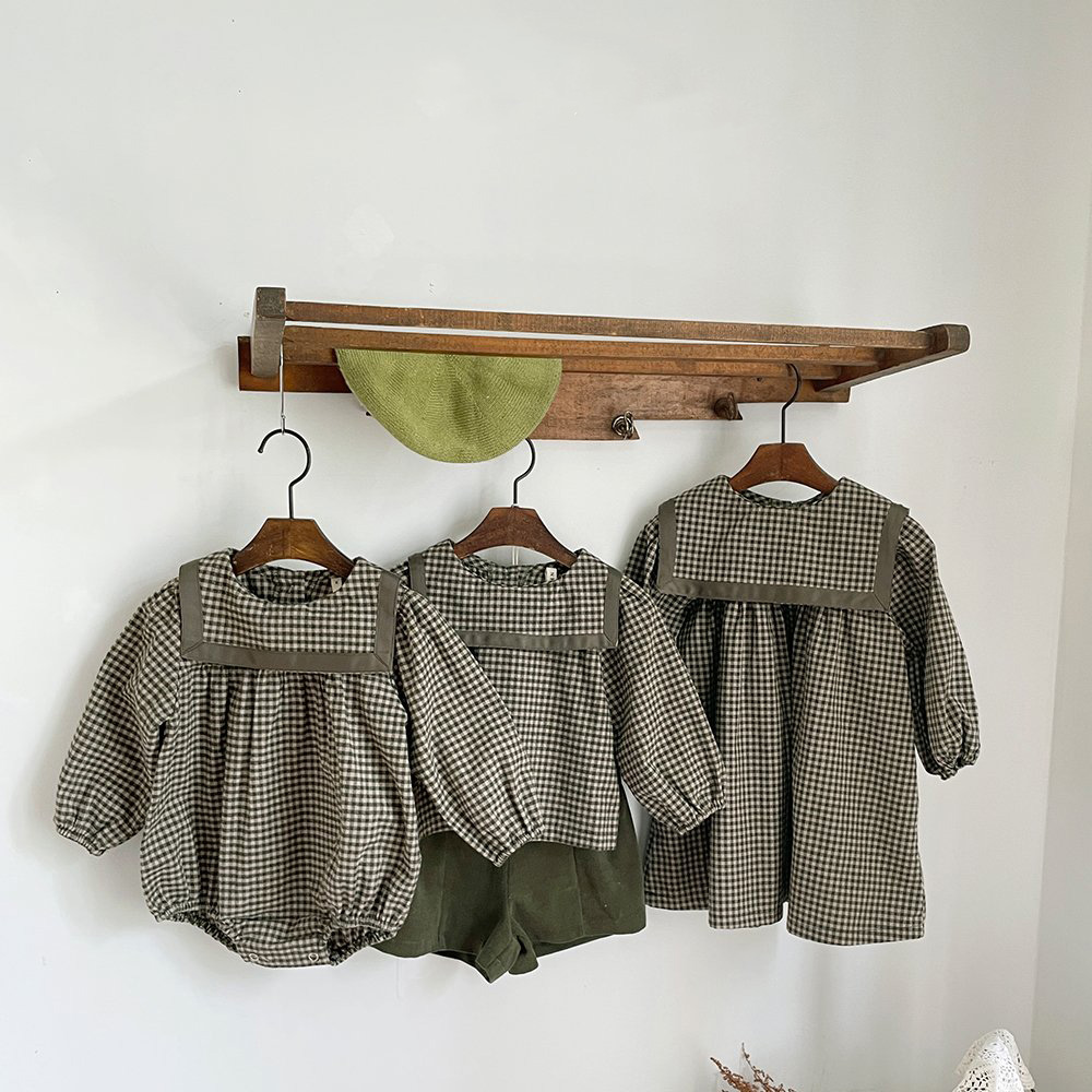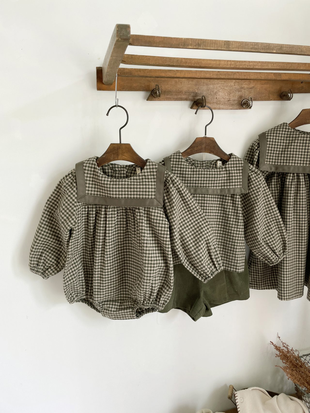 The sweetest fall romper, made of organic cotton. A beautiful, cozy, comfortable fabric, which offers comfort and warmth. Features an empire collar, puffy sleeves gathered at the wrists.