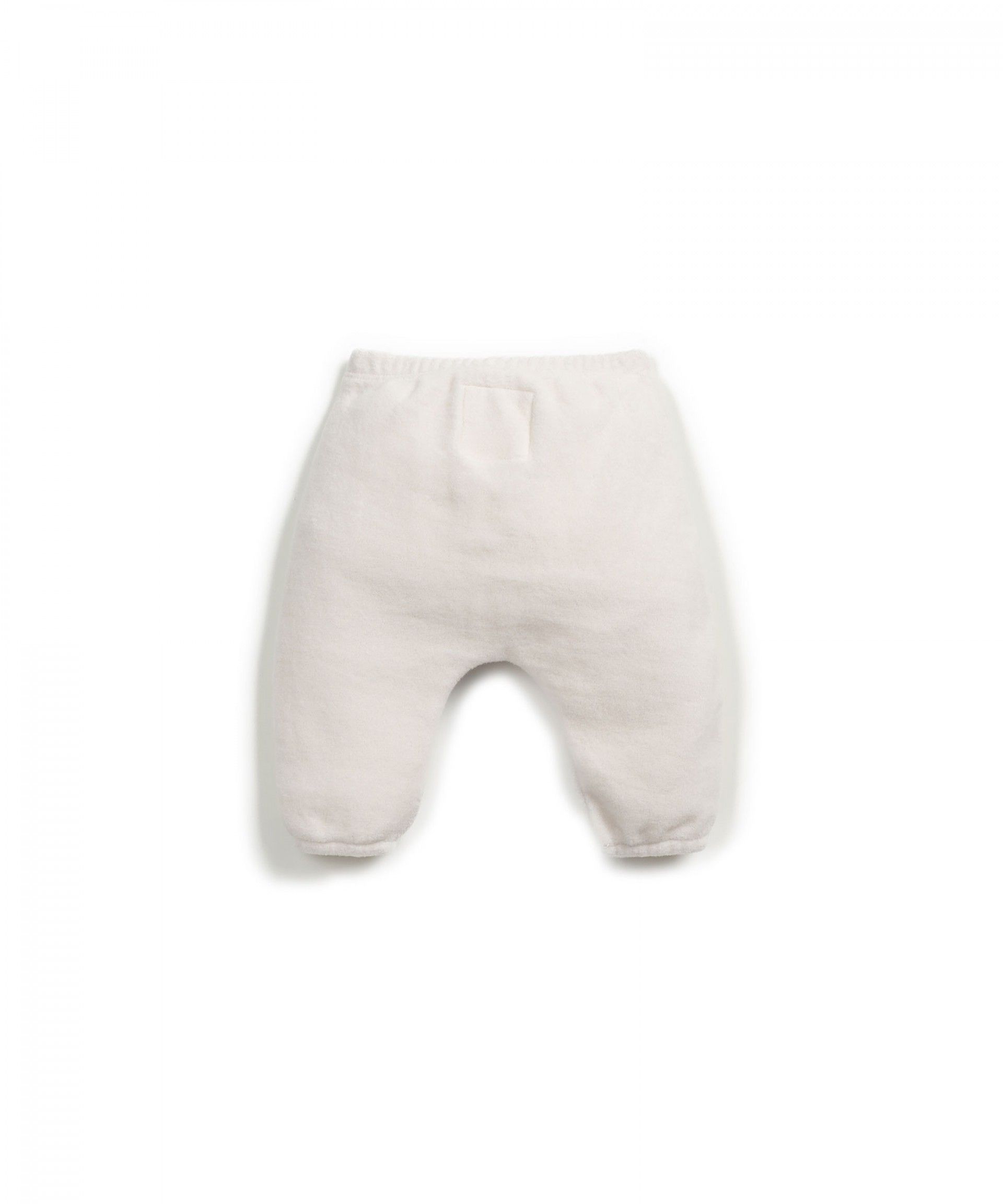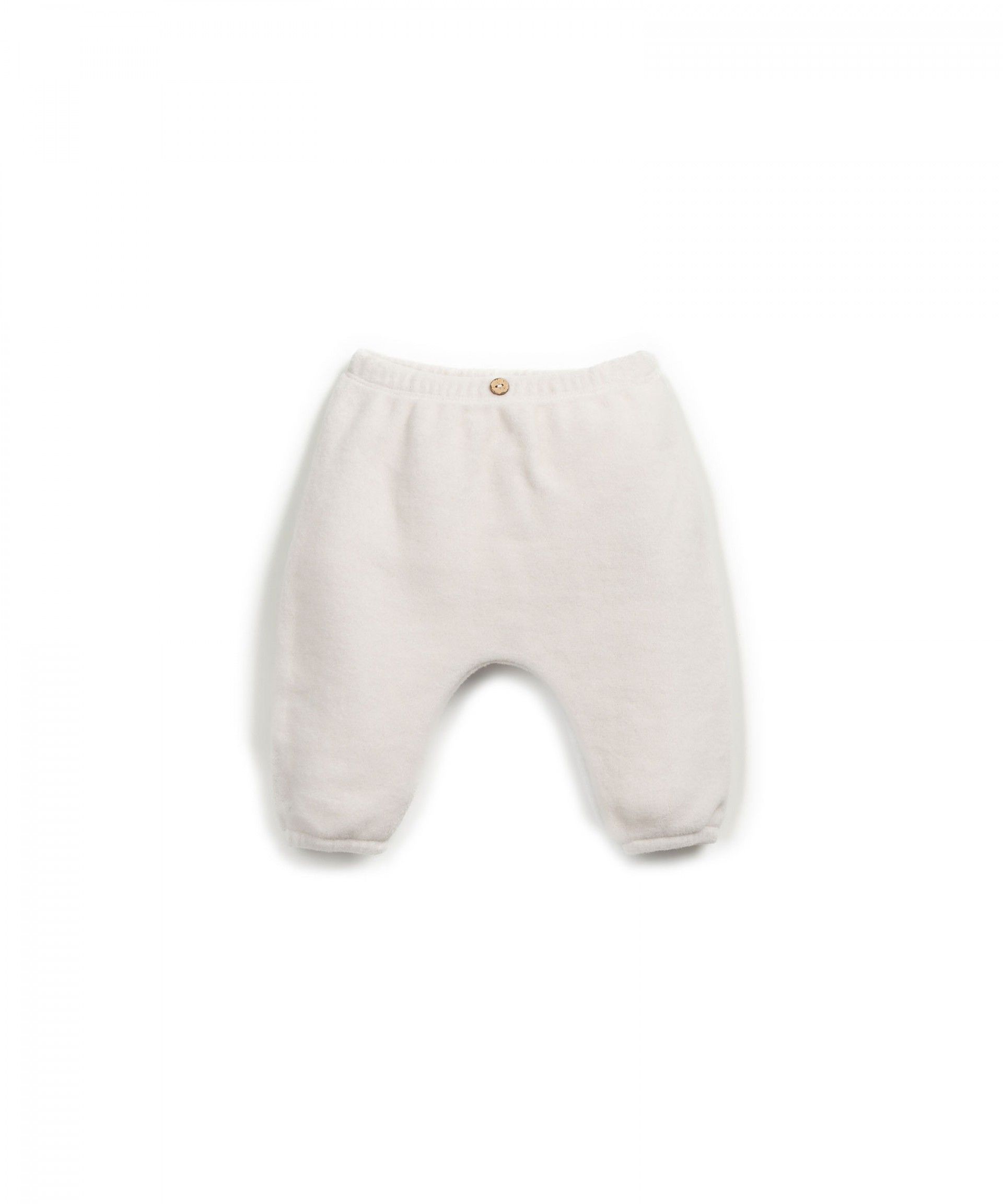 These leggings are made from jersey with a blend of cotton, recycled polyester and recycled cotton, in Ecru color. They feature the Re(Play) yarn derived from recycling our post-industrial waste. This model has an elastic waistband and a decorative coconut button appliqué.